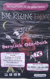 Das Figurentheater Köln zeigt am 23.10.2010 das Kinderstück „Die kleine Hexe“. Die Aufführung beginnt um 14:00 und 16:30 Uhr im Bürgerhaus Steinbreche in Refrath. Der Eintritt beträgt 7 Euro. Weitere Informationen finden Sie auf der Internetseite des Figurentheater Kölns.